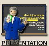 Quelques maladies qui répondent à la photothérapie aux UVB: Psoriasis vulgaire, vitiligo, eczéma, folliculites, furonculoses, pityriasis rosé de Gibert, pityriasis lichénoïde chronique, parapsoriasis en plaques, mycosis fongoïde, prurit idiopathique, prurit des insuffisants rénaux, acné. La photothérapie aux UVB pourrait aussi être combunée à d'autres modalités de traitement tels que: l'anthralin, les crèmes à base de stéroïdes, le calcipotriol, la PUVA, les rétinoïdes, le méthotrexate et la cyclosporine pour contrôler les cas lourds de psoriasis. Ces modalités pourraient aussi être utilisés en rotation afin de minimiser les effets secondaires provenant de chacun d'eux. Les effets secondaires des rayons UVB: À court terme: rougeurs, démangeaison, sécheresse et inflammation des yeux. À long terme: photovieillissement, cancers de peau et cataractes, surtout chez les types de peau I et II. Cependant, les doses thérapeutiques d'UVB, administrées sous surveillance médicale comportent relativement peu de risques. Le traitement combiné de rayons UVB et de goudron: Consiste en l'application d'une préparation de goudron sur les lésions une à deux fois par jour suivie d'un bain à l'huile pour éliminer l'excès de goudron et l'exposition aux UVB par la suite. La dose de rayons UVB a pour but de rougir à peine la peau. Récemment, on a découvert que des doses inférieures de rayons UVB étaient aussi capables de blanchir le psoriasis en évitant cette rougeur. C'est de cette façon que l'on traite d'ailleurs les personnes ayant une peau très sensible ( type de peau I ou II). La fréquence de ces expositions aux rayons UVB varie de 3 à 5 fois par semaine. Les lésions de psoriasis disparaissent en 6 à 8 semaines chez 80 % des cas. Si le psoriasis résiste aux deux types d’UVB, la PUVA (Psoralène + UltraViolets de type A) reste à être considérée. Protection à l’intérieure de la cabine: des lunettes de type coque, "goggles" doivent être portées lors de l'exposition aux rayons UVB afin de prévenir les complications oculaires à court et à long terme. Aussi, on recommande fortement que chaque personne porte ses propres lunettes protectrices dans le but d’éviter la contagion. Les organes génitaux mâles doivent être protégés par une coquille (jackstrap) car ces parties sont plus sujettes au développement du cancer de la peau. Contre-indications: la photothérapie est contre-indiquée pour les personnes sensibles au soleil. On exclue également les patients ayant déjà développé des cancers de peau ou qui ont subi de la radiothérapie. Attention: Certains médicaments diurétiques tels que les thiazides, certains antibiotiques tels que les tétracyclines et encore d'autres médicaments comme les antidépresseurs peuvent vous occasionner des réactions de photosensibilisation; c'est à dire un coup de soleil anormalement sévère pour l'intensité d'exposition. Les parfums et les produits parfumés peuvent causer cette même réaction. Ils doivent ètre évités durant le traitement. Le traitement UVB au TL01 est donné à raison de deux à trois fois par semaine ne dépassant pas le rythme d'une séance aux deux jours . [footer.htm] |